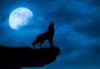 Description: Image of an orange sun on the horizon, with the black silhouette of a wolf in front of it.